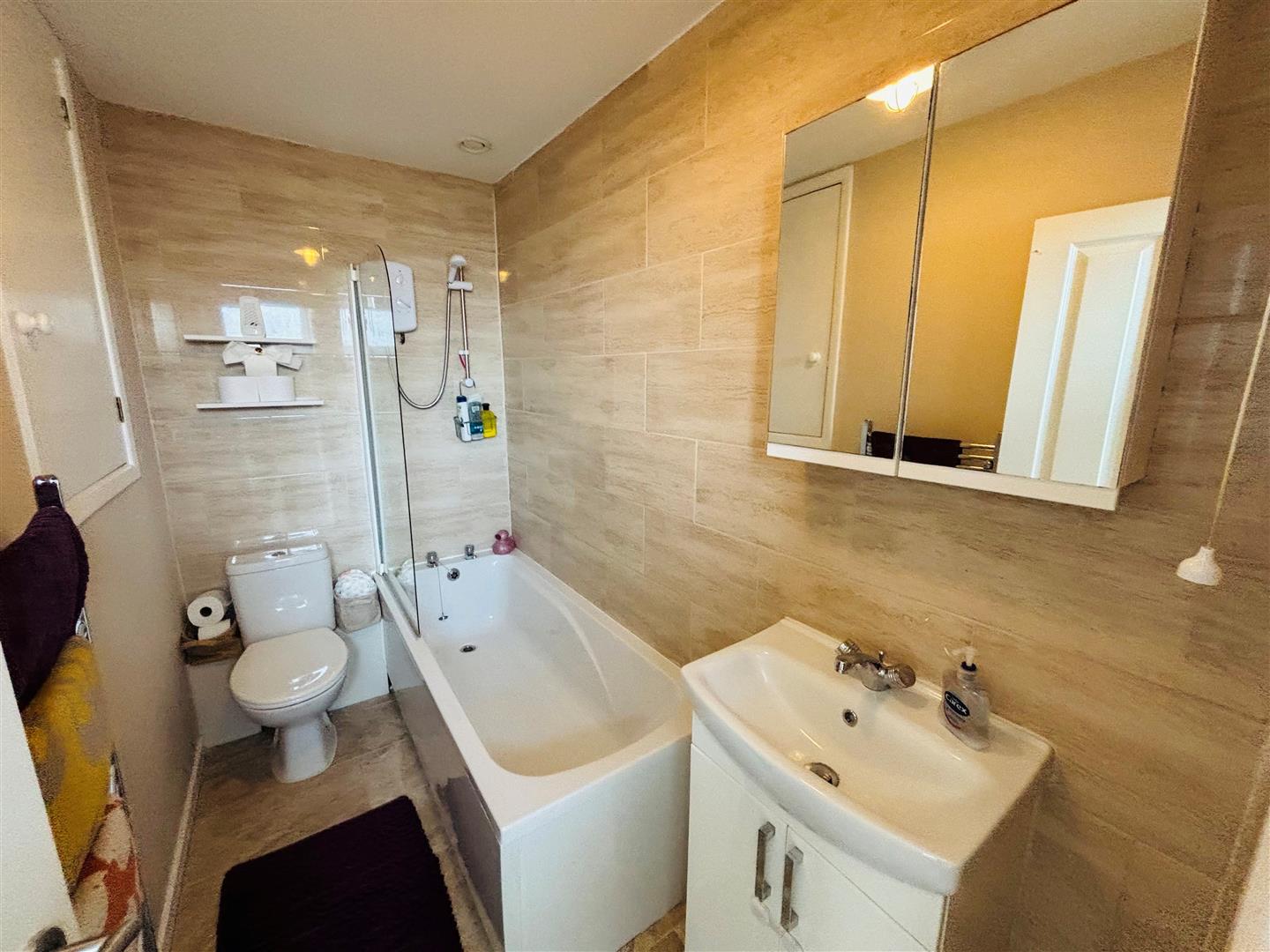 A white suite comprising a panelled bath with shower over, low level W.C, vanity wash hand basin with cupboard below, tiled walls, airing cupboard, heated towel rail.