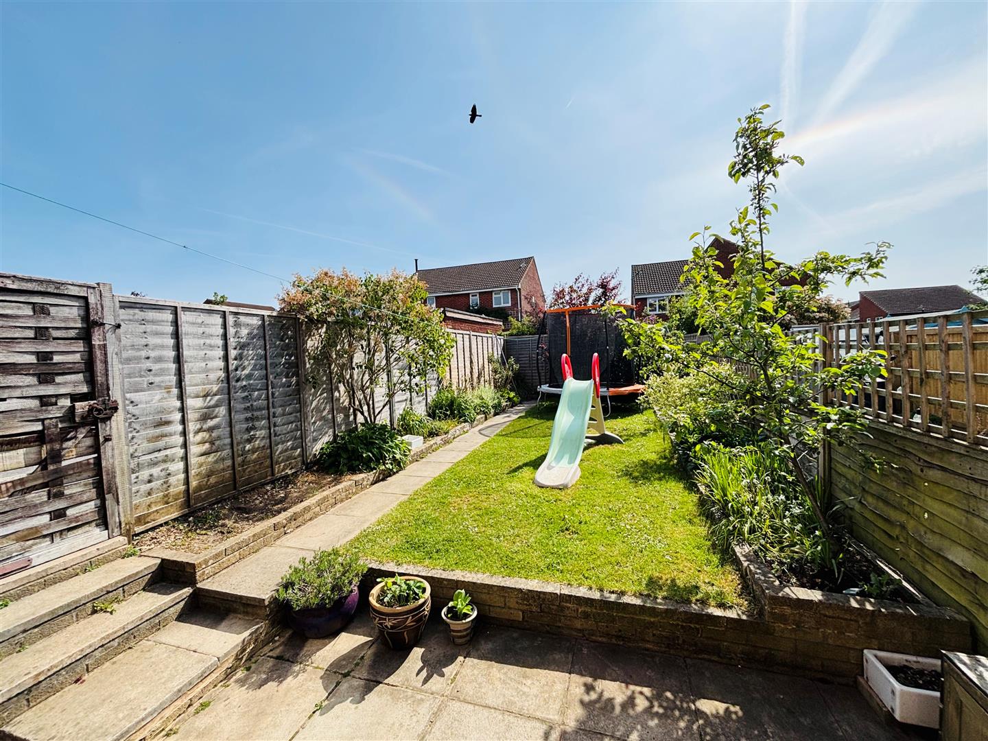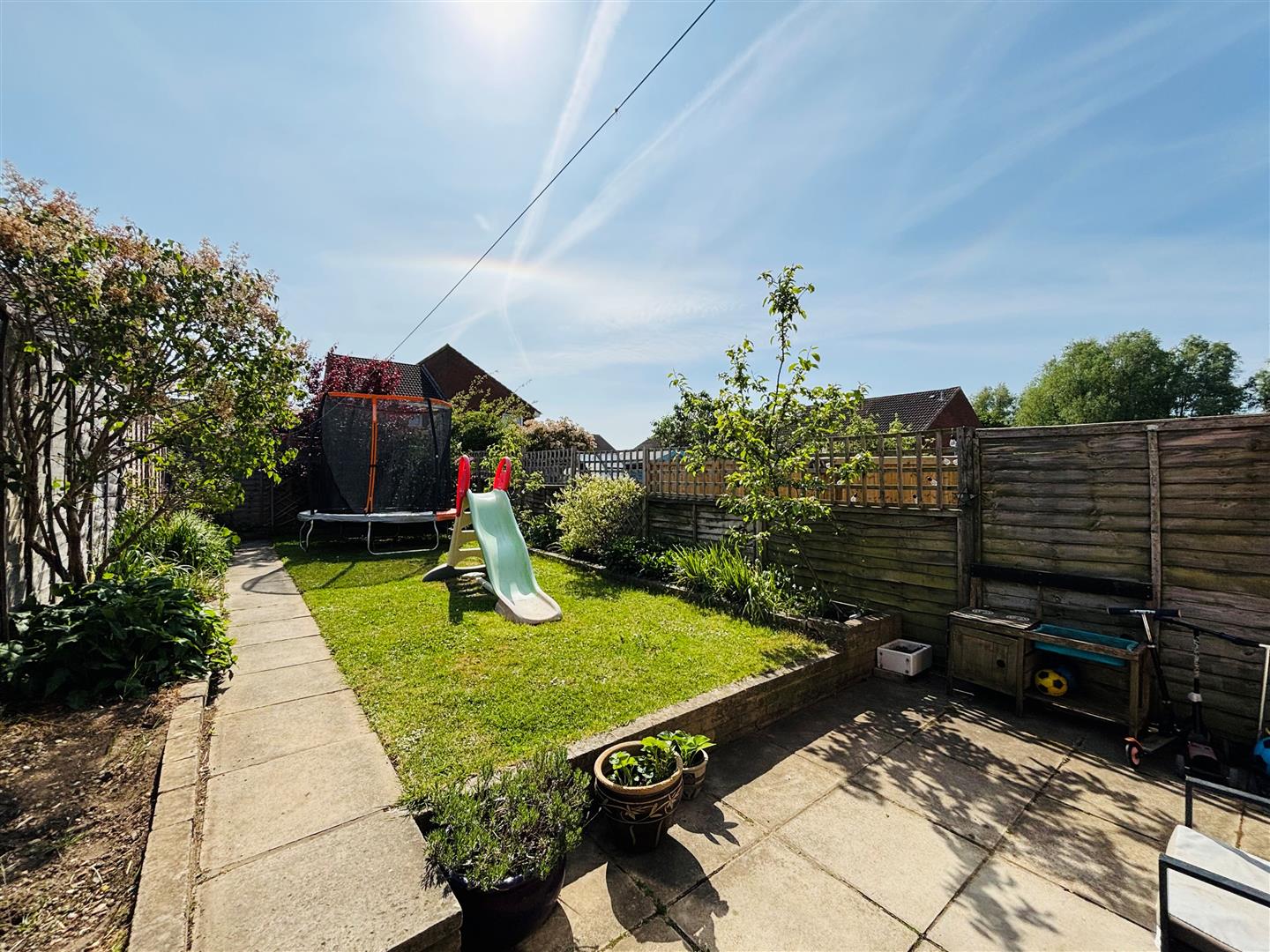 Enclosed by timber fencing, paved patio with steps up to lawn area, pathway to rear garden, side and rear gate.
