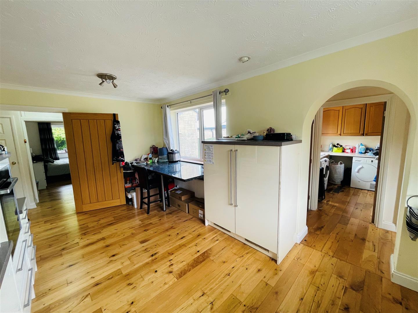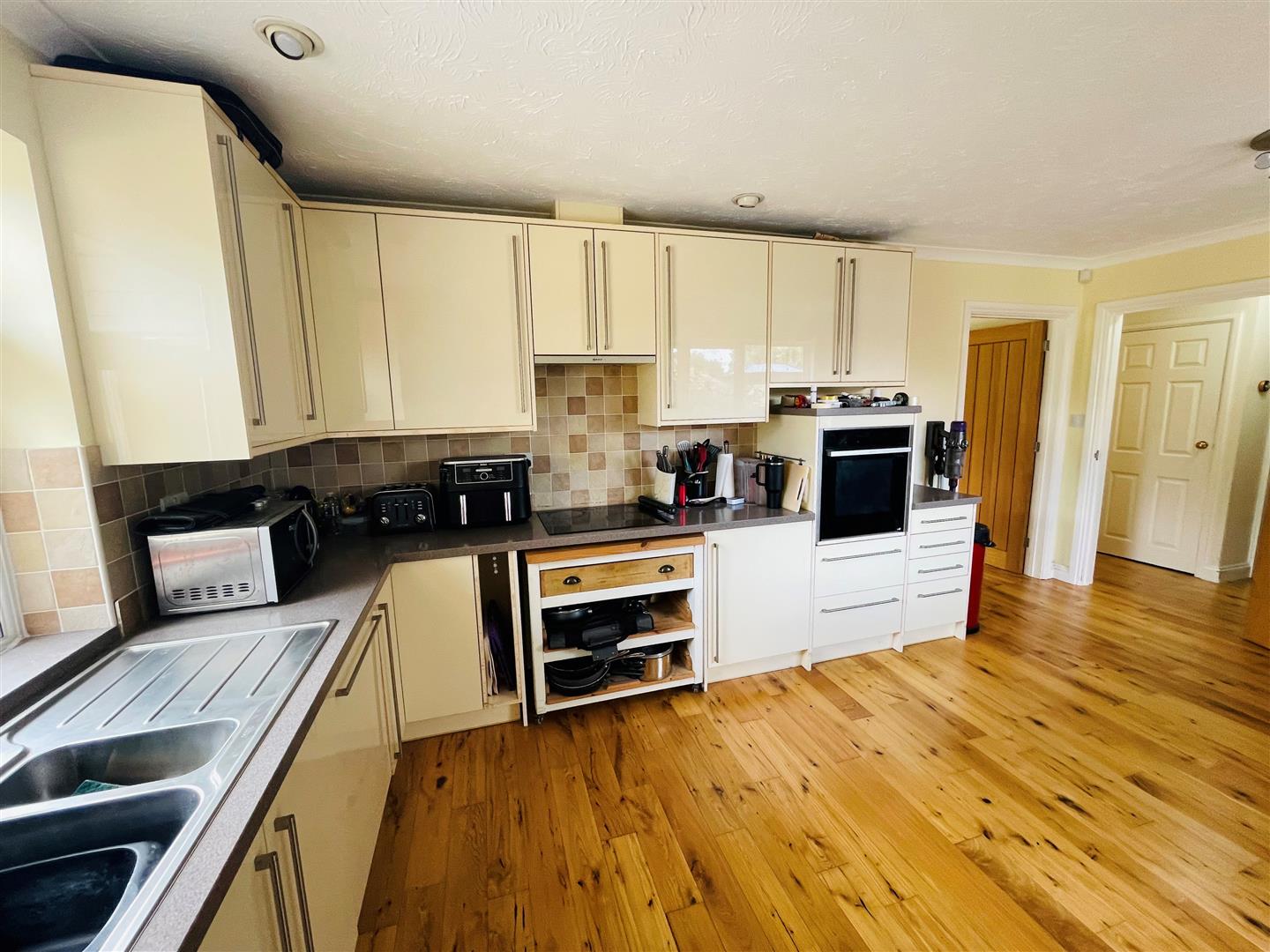 Dual aspect double glazed windows to the front and side. A range of fitted wall and base units and drawers with work surface over, stainless steel one and a half bowl sink inset with mixer tap, tiled surrounds, inset electric hob with an extractor above and a built-in oven below, integrated dish washer, breakfast bar, radiator, engineered Oak flooring.