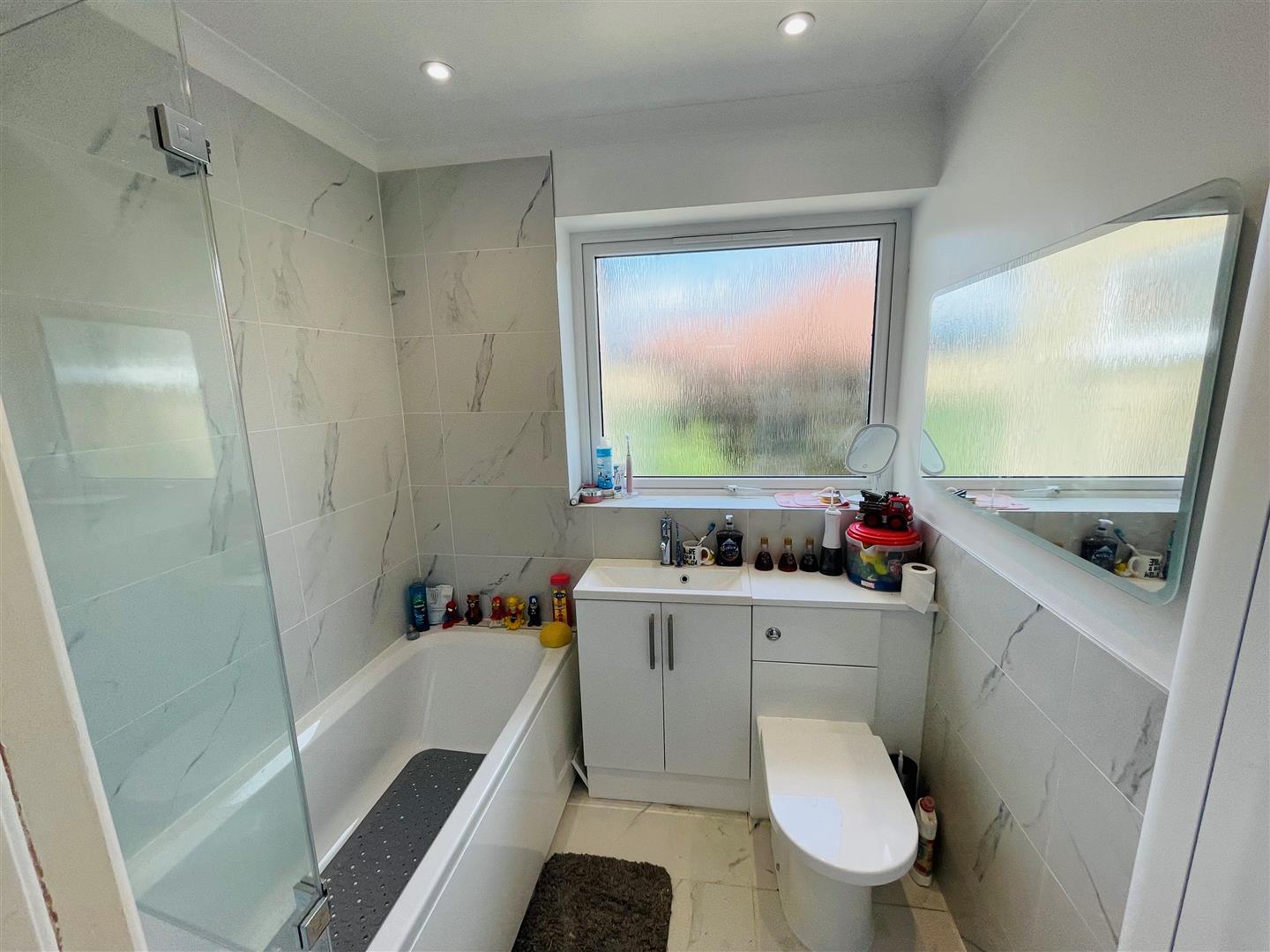 Obscure double glazed window,. A suite comprising a panelled bath with a shower over, wash hand basin with a cupboard below, low level W.C with an integrated cistern, tiled surrounds, radiator. under floor heating.