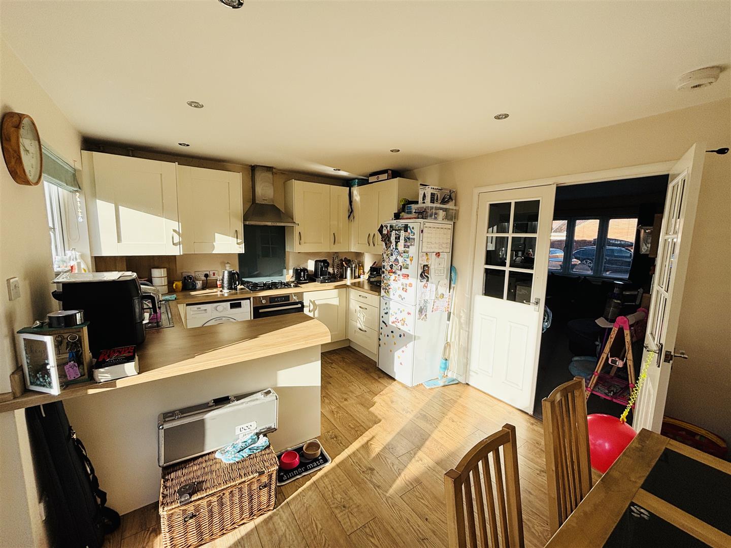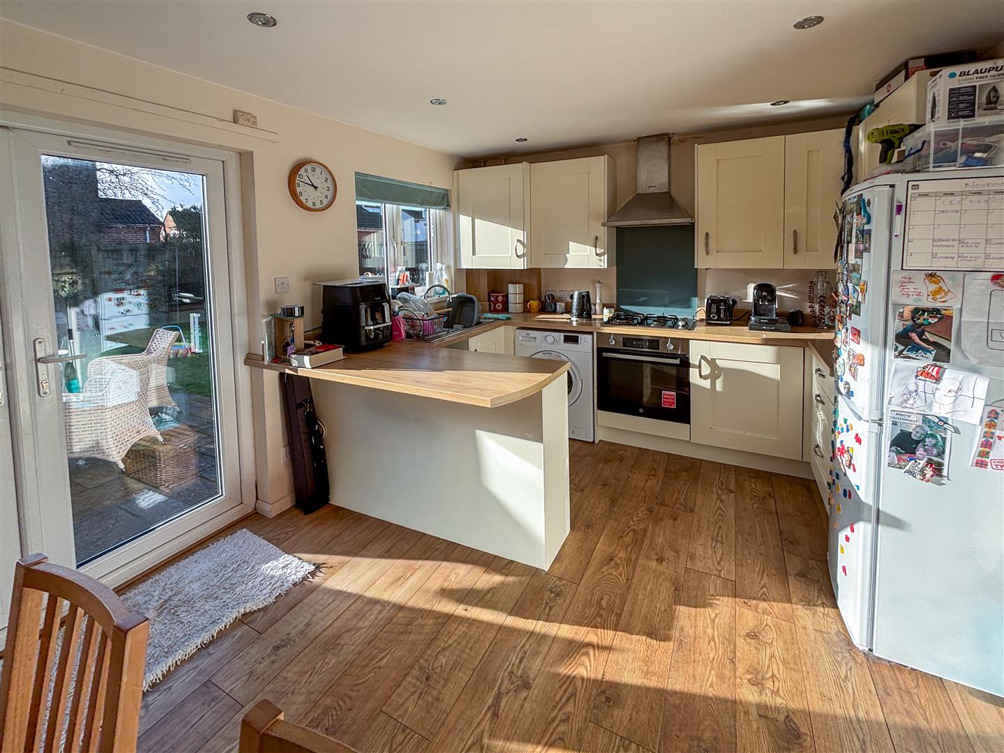 Double glazed window and double glazed french doors opening onto the rear garden. A range of wall and base units with work surface over and matching up stands, stainless steel sink inset, breakfast bar, built-in gas hob with extractor hood above and oven below, space and plumbing for automatic washing machine, radiator.