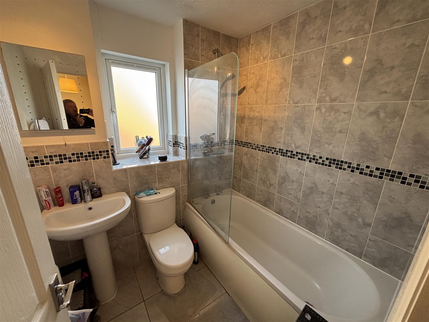 Obscure double glazed window to side. A white suite comprising a panelled bath with tiled surrounds and a glazed screen, low level W.C, pedestal wash hand basin, heated towel rail.