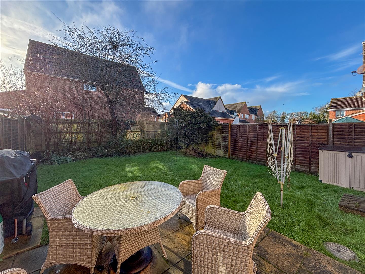 The fully enclosed rear garden is laid mainly to lawn with shrub borders and a patio area, outside tap. .