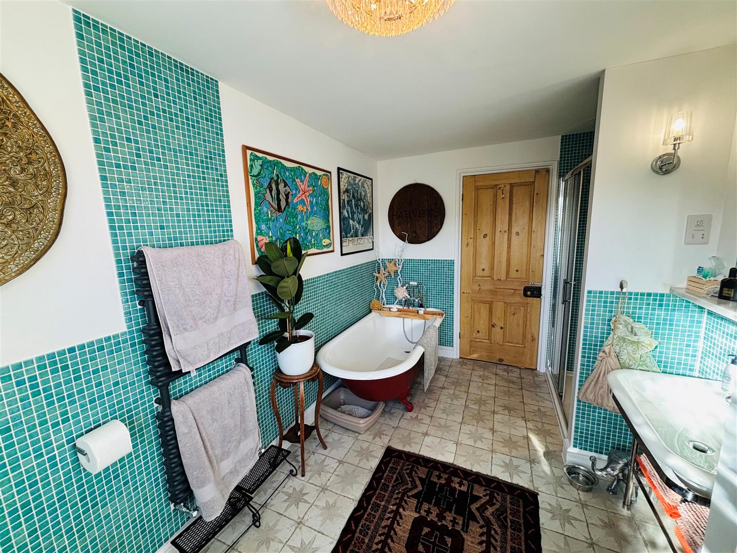 Low level W/C, wash hand basin, shower cubicle, radiator, bath, double glazed window.