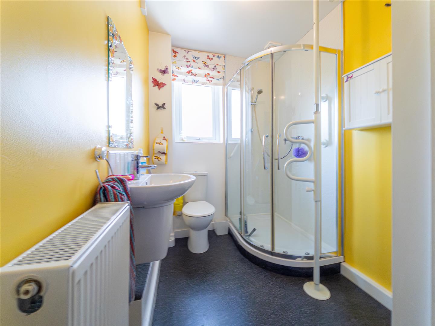 Obscure double glazed window to rear, a shower cubicle, low level W/C, pedestal wash hand basin, built-in airing cupboard housing gas boiler.
