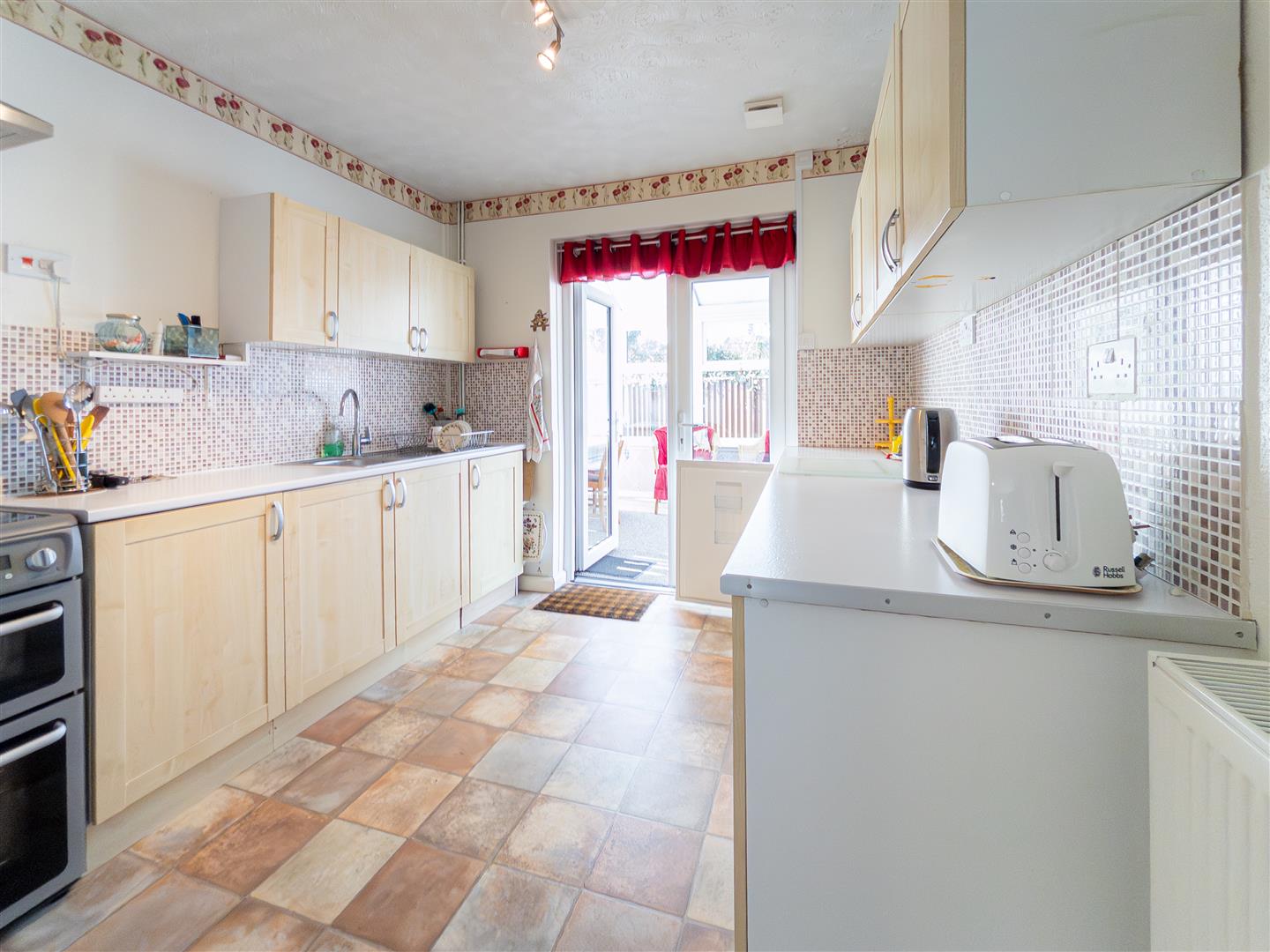 Range of wall and base units with work surface, sink inset with mixer tap and tiled surrounds, space and point for electric cooker, double glazed door to: