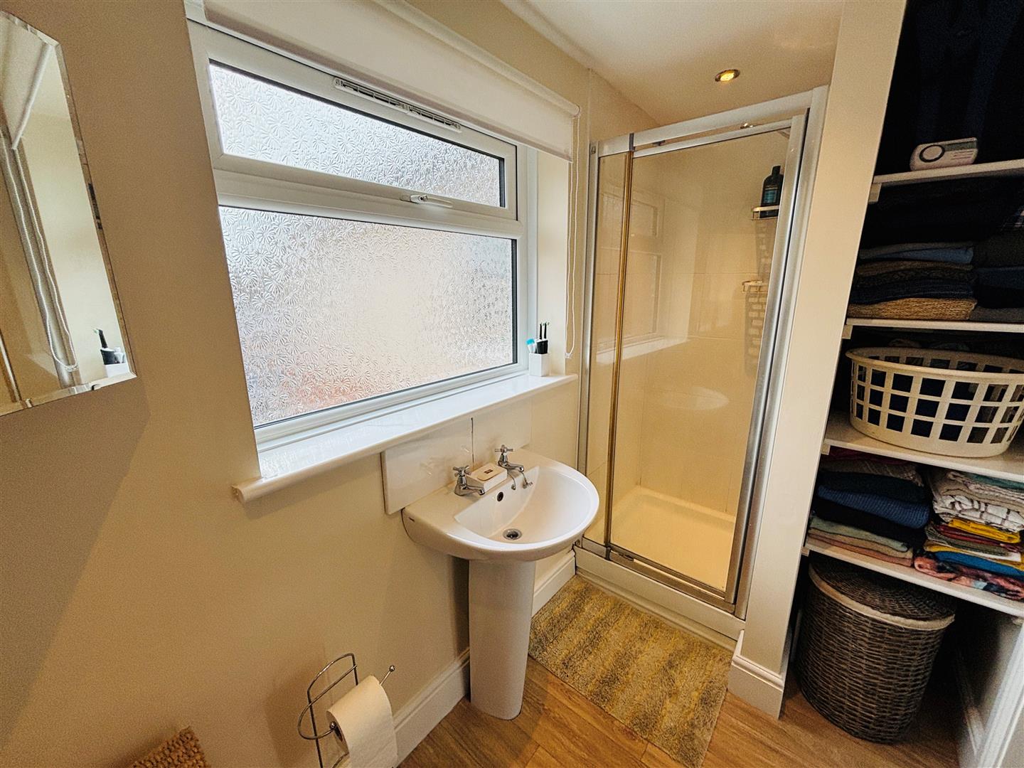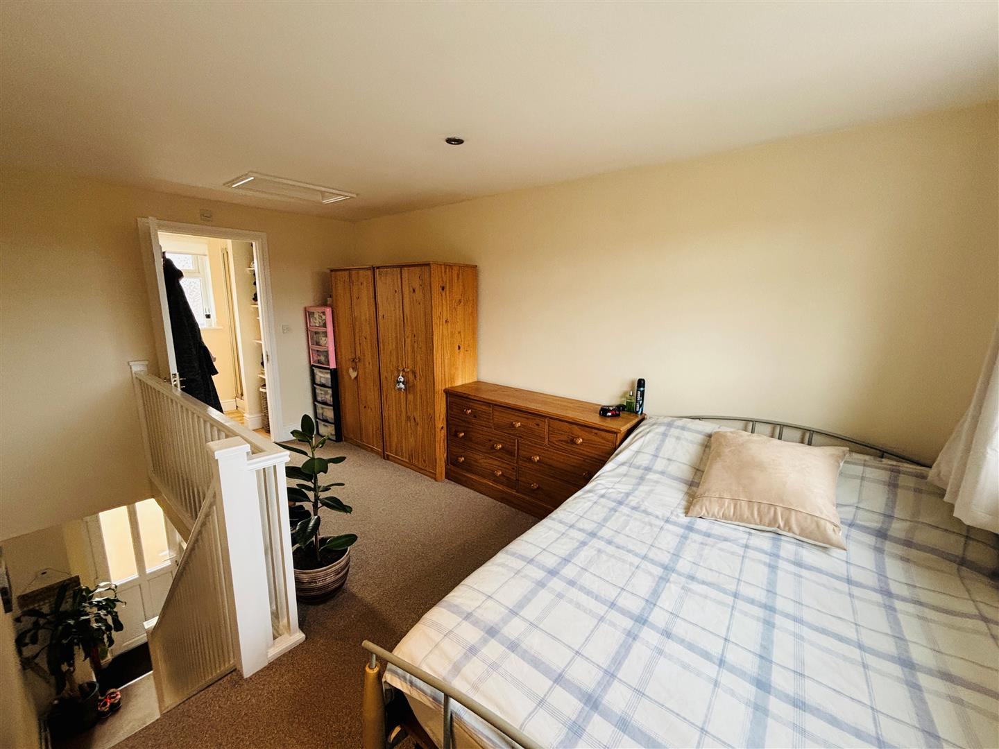 Upstairs is the bedroom with natuaral light from the large window, and loft access. A shower room, includes storage space beside the shower cubicle.