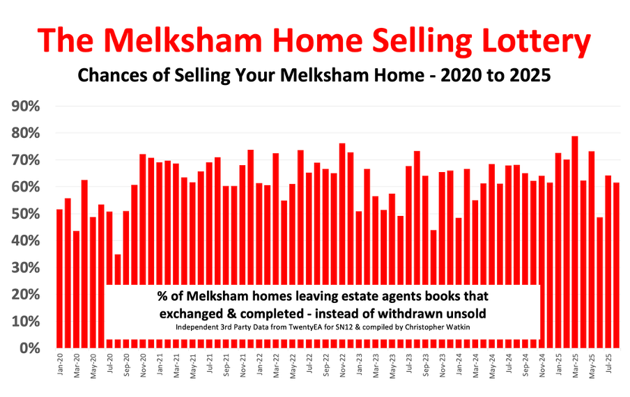 - Of the 489 Melksham properties that left estate agents’ books in 2025 (so far), 7% exchanged and completed. The other 33.3% of homeowners, a total of 163 homes, withdrew from the market unsold.