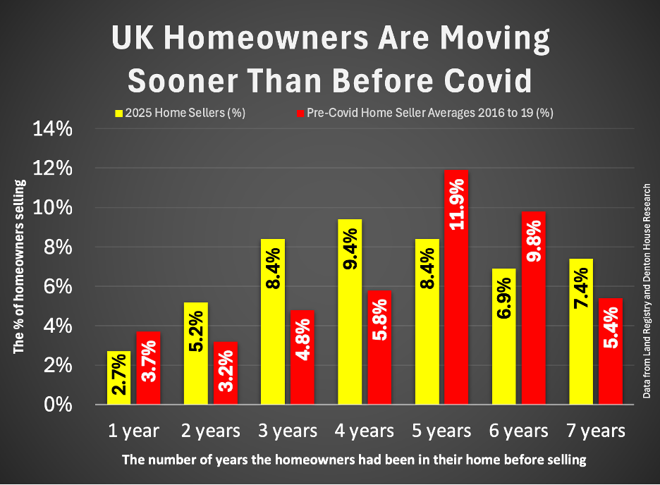 The real change lies in when people are moving. Pre-Covid, more sales happened in years five and six of ownership. Today, there is a clear uplift in people moving earlier, particularly in years three and four.