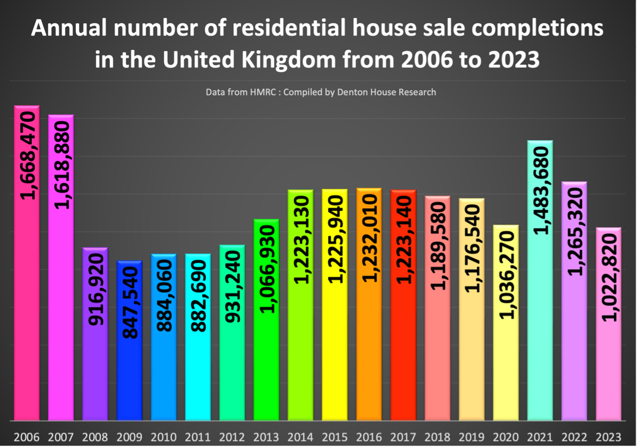 The impact of economic challenges on the property market has been more evident in transaction volumes than in prices. Typically, there are about 1.16 million house sale completions annually in the UK. However, this number surged to 1.48 million in 2021 due to the lockdown inducing ‘race-for-space’. It then dropped to 1.26 million in 2022 and further to 1.02 million last year.
