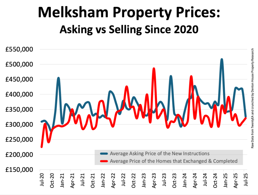 Since the summer of 2020, we’ve been tracking two key numbers: the average asking price of homes coming to market in Melksham, and the average sale price of homes that exchanged and completed. The results are striking and eye-opening.